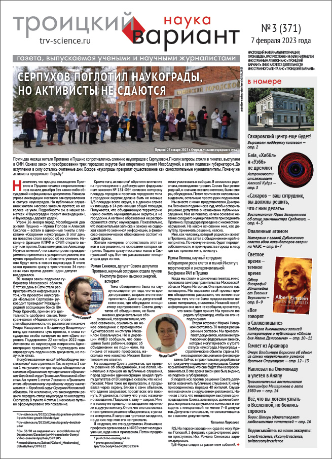 Редакция ТрВ сообщает, что газета продолжит выходить, пока существует такая возможность. Следующий выпуск – 5 апреля. Основная проблема для газеты сейчас – недостаток качественных материалов. Постоянным авторам не до статей, когда идет война. Поэтому, редакция обращается к русскоязычным ученым всего мира с просьбой поддержать «Троицкий вариант» качественными научно-популярными статьями.