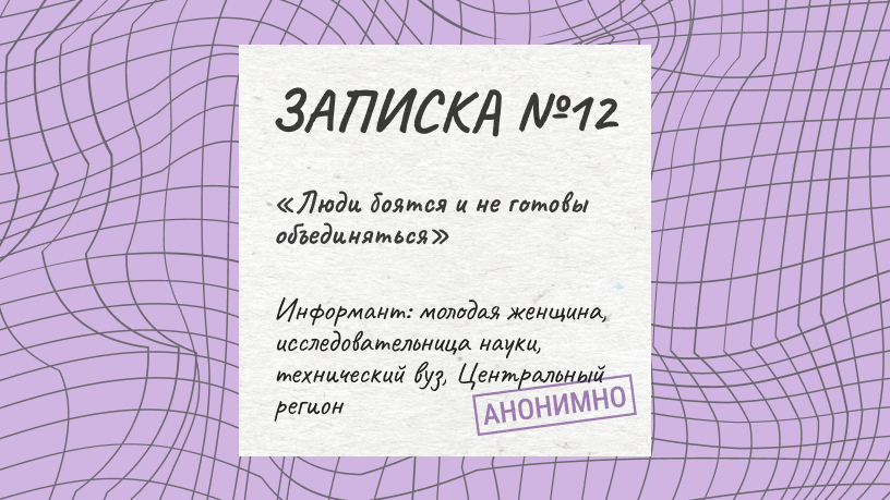 Руководитель нашего центра — человек весьма интеллигентный, чрезвычайно хорошо образованный. Но я заметила, что во время регулярных совещаний он сознательно проговаривает позицию лояльности: «только не подумайте, что я чего-то там не одобряю». Он, скорее всего, не поддерживает СВО, но хочет снизить свои риски попасть под каток репрессий. В рабочем чате центра пару раз я заметила его открытое, демонстративное одобрение военных действий («Разумеется, кроме победы, мы ничего не можем желать нашей армии»). Симптоматично, что его поддержали всего несколько человек, а остальные не сочли нужным ничего сказать. Зачем это было? Чтобы, если кто-то решил посмотреть чат, удостоверился бы в его благонадёжности?