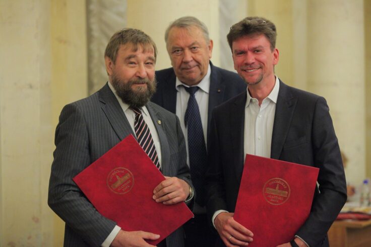 На вручении премии им. Лебедева РАН, 2015 год. Facebook С. Абрамова. (Слева направо: Сергей Абрамов, Владимир Фортов, президент РАН (2013-2017), Всеволод Опанасенко, владелец компании «Т-Платформы»)