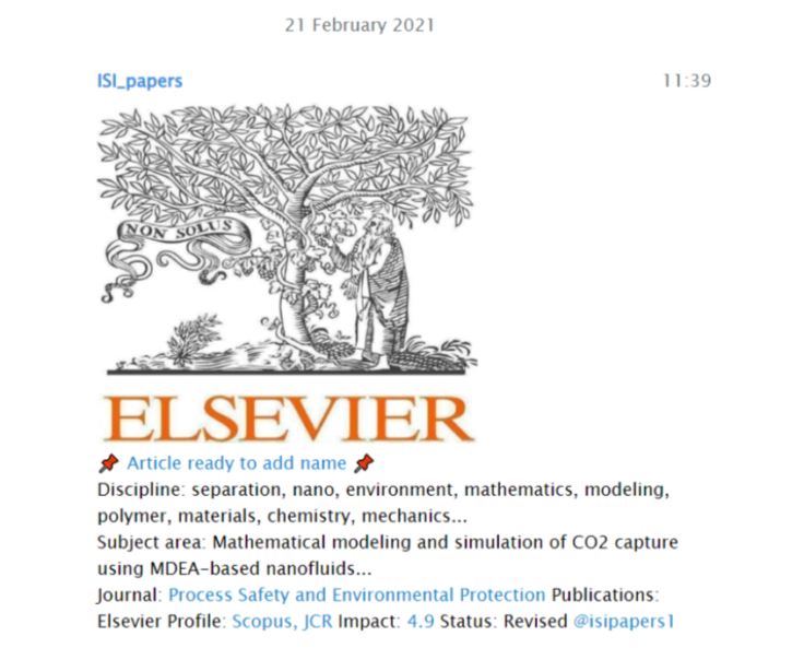 В 2021 году Afrasyab Khan (ЮУрГУ) и соавторы из Кувейта, Малайзии, Ирана, Вьетнама и Китая опубликовали статью Mathematical modeling and numerical simulation of CO2 capture using MDEA-based nanofluids in nanostructure membranes в журнале Process Safety and Environmental Protection, реклама продажи авторства которой была ранее размещена в телеграм-канале одной из фабрик фальшивых публикаций. Редактор журнала пришел к выводу, что эта статья представляет собой злоупотребление системой научных публикаций. Статья была ретрагирована.