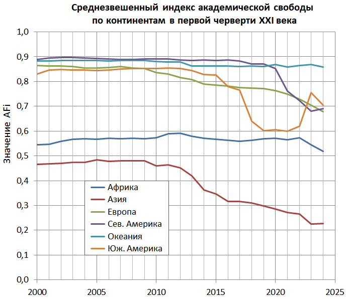 Если взять долгосрочные ряды данных AFi, то можно обнаружить, что проблемы с академической свободой начинаются даже раньше, чем пишут Scientists at Risk. В первой декаде века практически на всех континентах средневзвешенные показатели AFi оставались практически неизменными — высокими (0,85–0,90) в Европе, Америке и Океании, и средними (0,47–0,57) в Азии и Африке. Однако с 2010 года они начинают постепенно снижаться в Азии и Европе, потом в Южной Америке, а с 2018 года и в Северной. Незатронутыми этим процессом остаются только Океания и, в меньшей мере, Африка.