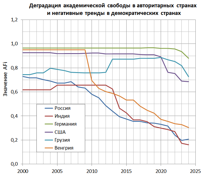 3. Наконец, еще один паттерн — постепенная деградация академической свободы под давлением лидеров с автократическими импульсами, имеющих поддержку среди населения. Здесь наиболее характерен пример России, где постепенный упадок академических свобод наблюдался на протяжении всего правления Путина и укрепления его авторитарного режима. (С началом полномасштабной агрессии против Украины этот процесс ускорился и стал ближе к первому сценарию.) Похожий процесс наблюдается в Индии после прихода к власти в 2014 году партии, ориентированной на индуистский национализм. В Венгрии обвал индекса академической свободы произошел в 2010 году после победы партии Виктора Орбана, и с тех пор его снижение продолжается. В Грузии спад AFi нарастает с 2020 года по мере усиления российского влияния. Однако отчет SAR обращает внимание на появление подобных тенденций и в западных демократиях, таких как США, где первые признаки неблагополучия отмечаются в 2020 году, и Германия (с 2023 года).