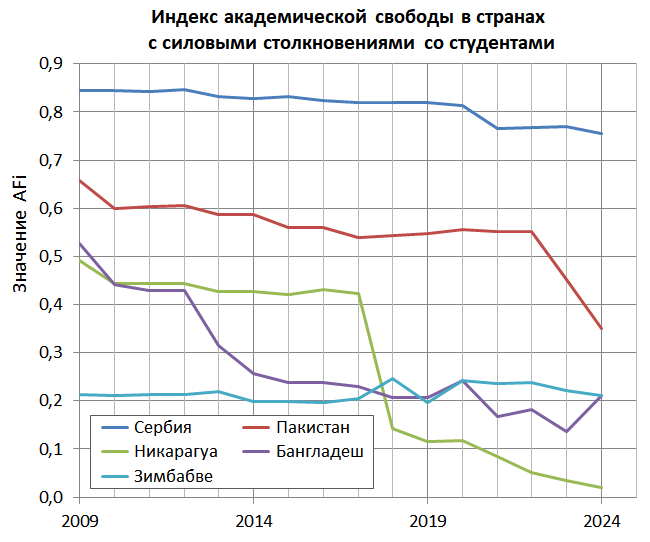 2. Другая характерная ситуация иллюстрируется примерами таких стран, как Бангладеш, Пакистан, Сербия, Зимбабве и Никарагуа. В них масштабные студенческие протесты сталкивались с применением силы со стороны властей. Несмотря на это, в первых четырех странах потери академической свободы были ограниченными, тогда как в Никарагуа она была фактически уничтожена в 2018 году, когда кампусы штурмовала полиция, так как они были очагами оппозиционного сопротивления. Более 150 профессоров были уволены, некоторые университеты закрывались, в 2020 году был принят закон об «иностранных агентах», подобный российскому. В итоге индекс AFi с 0,42 упал сначала до 0,14, а сейчас составляет уже 0,02. В столкновении с авторитарной властью академическое сообщество Никарагуа потерпело полное институциональное поражение, в отличие от четырех других стран, где университетам удалось отстоять свою автономию, по крайней мере частично. Впрочем, тренд в Бангладеш и Пакистане неблагоприятный.
