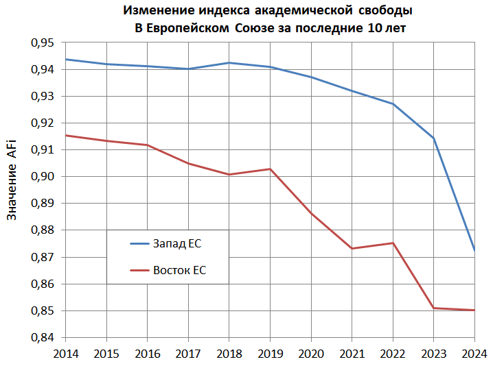 Пока снижение академической свободы в демократических странах еще не приобрело обвального характера, однако уже ясно, что это не случайная флуктуация, а формирующийся тренд. Мы использовали данные AFi, чтобы проследить его на примере Европейского Союза. В странах, которые в прошлом находились в составе восточного блока, уровень академической свободы в 2014 году был ниже, чем в странах Западной Европы, и раньше начал снижаться. Однако с 2020 года, фактически с пандемии COVID-19, академическая свобода стала сокращаться и в западных странах ЕС, причем в последний год это снижение идет там быстрее, чем на востоке. Впрочем, мировое лидерство по индексу академической свободы удерживают, довольно неожиданно, как раз восточноевропейские страны — Чехия на первом месте и Эстония на втором.