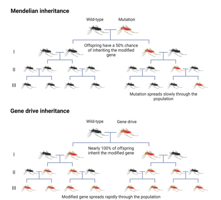 Суть технологии генного драйва в создании аллеля гена, который будет передаваться от модифицированной особи почти всем потомкам — от 99% и выше, а не 50%, как обычно при половом размножении. Так изменения сохраняются в популяции и распространяются в ней в течение нескольких поколений. Внедряемый ген может выполнять определенную функцию, например, у особи могут появляться только потомки мужского пола. Это имеет смысл для уничтожения видов комаров, переносящих малярию, — то есть комаров рода Anopheles, в частности Anopheles gambiae.