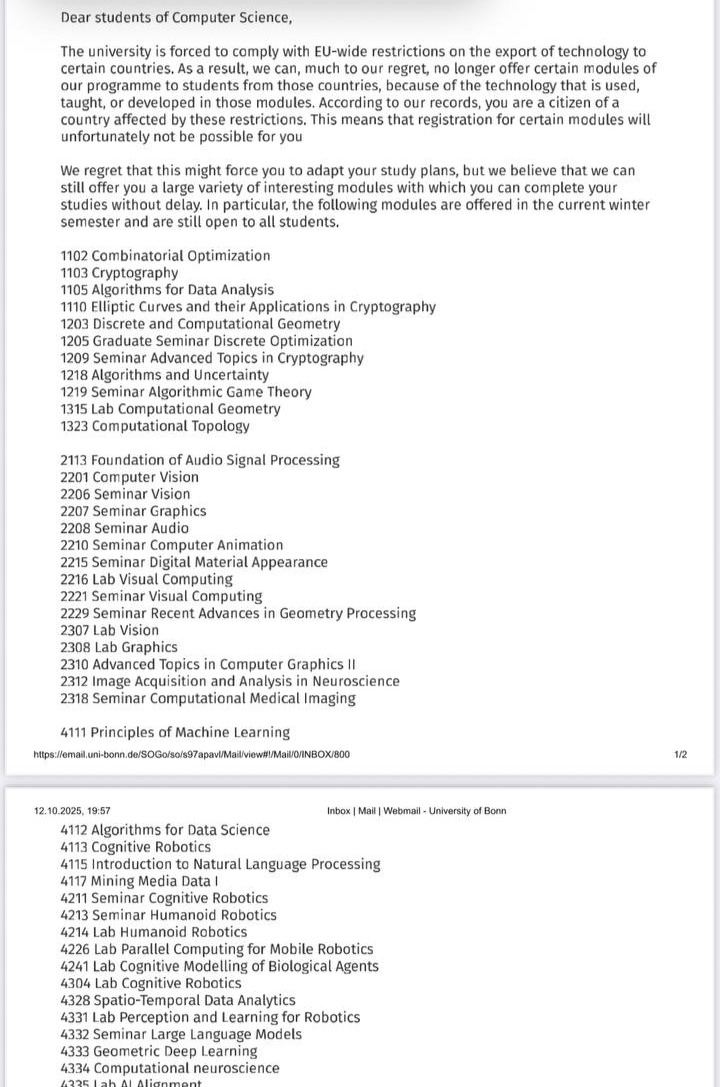 Но более масштабная и показательная история произошла в Германии в октябре 2025 года. Магистранты университета Бонна с российскими, иранскими и китайскими паспортами получили письма: из-за санкций им закрывают доступ к большинству курсов по кибербезопасности, криптографии и IT-security. Целое направление Communication Management оказалось под полным запретом — студентам предлагают либо срочно менять специализацию, либо уезжать в другой вуз. Университет утверждает, что выполняет требование федерального правительства по контролю технологий двойного назначения.