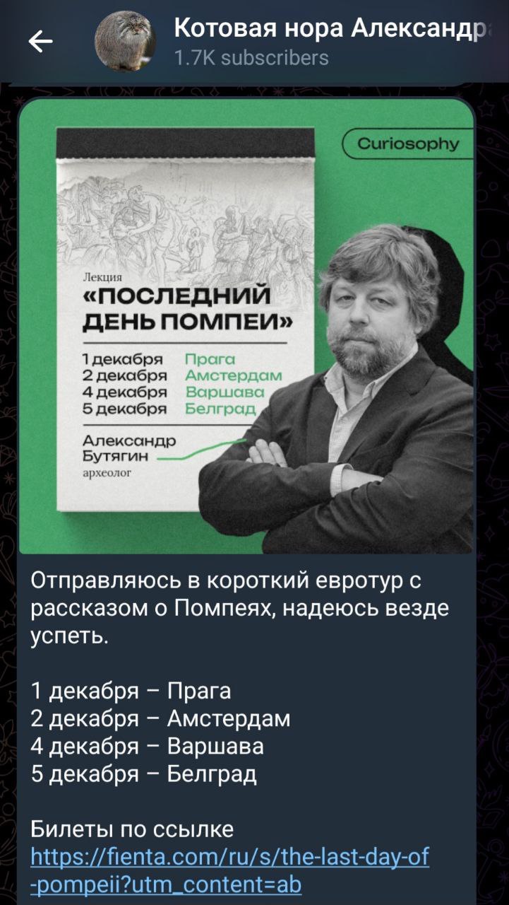 Напомним, известного российского археолога, антиковеда, популяризатора истории, куратора выставок в Эрмитаже Александра Бутягина задержали 4 декабря, перед третьей лекцией «Последний день Помпеи» в Варшаве. Два предыдущих выступления, в Праге и Амстердаме, состоялись по расписанию, на 5 декабря была запланирована лекция в Белграде. Организатором лекций в телеграм-канале ученого был указан проект Дмитрия Алешковского Curiosophy.events. Сам Алешковский от комментариев отказался.