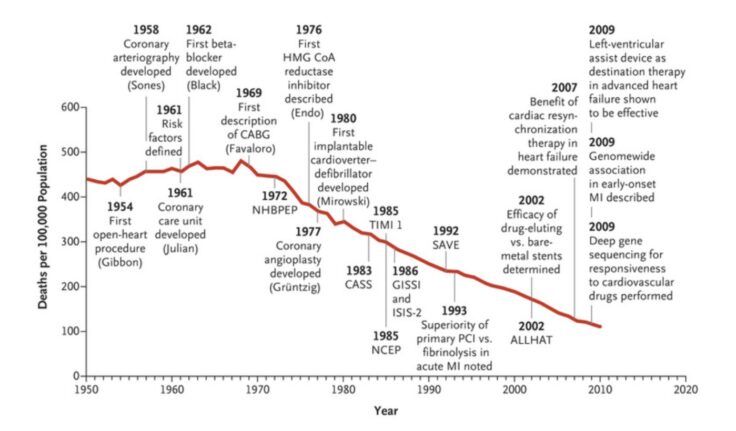 Важно подчеркнуть, что примерно с 1970-х годов смертность от сердечно-сосудистых болезней снизилась в США на 70%: ранее погибало 450 человек на 100 000 населения, а в 2010 году — 100 человек. В 2012 году ведущие кардиологи проанализировали, какие открытия стали причиной этого достижения. Оказалось, в основном это либо новые хирургические операции, либо различные устройства. Вклад фармакологии в решение сердечных проблем тоже есть, но не такой большой. Например, для лечения аритмий, которые часто приводят к смерти, практически нет лекарств,. Уже 25 лет подряд FDA — Американское агентство по надзору за качеством продуктов и медикаментов, не одобряло ни одного нового препарата против этого состояния. В основном врачи полагаются именно на приборные решения.