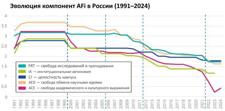 Россия — яркий пример постепенной эрозии академической свободы на протяжении четверти века. В 1990-х годах академическая свобода в России держалась на достаточно высоком по мировым меркам уровне. Спад совпал со Второй чеченской войной и приходом к власти президента Путина. Больше всего пострадала тогда свобода слова (ACE), а также отмечалось снижение показателей автономности университетов (IA) и неприкосновенности кампусов (CI), что, по-видимому, связано с усилением мер безопасности на фоне региональной войны. Тогда же возникает долгосрочный тренд снижения свободы академических обменов и распространения знаний (AED). Только свобода исследований и преподавания (FRT) оставалась почти незатронутой, позволив появиться и укрепиться таким ярким проектам, как ВШЭ, Европейский университет и Шанинка.