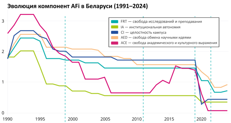Политизация университетов и идеологический контроль. Во всех трех странах университеты испытывают идеологическое давление, хотя и разной природы, что приводит к снижению таких компонентов AFi, как свобода исследований и преподавания (FRT), а также свобода академического и культурного выражения (ACE).