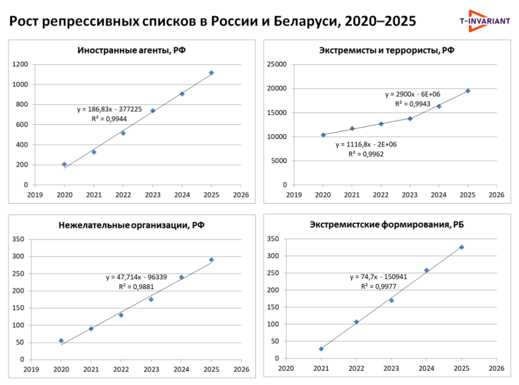 Интересно отметить, что мониторинг пополнения реестров показывает с 2021 года почти строго линейный рост: число иноагентов прибывает в среднем на 187 в год, список нежелательных организаций пополняется на 48 в год (и в последнее время там появляются всё новые университеты), белорусский список экстремистских формирований увеличивается на 75 в год, его российский аналог до 2023 года прибавлял по 1100 в год, а потом ускорился до 2900 в год. Линейный рост реестров указывает на то, что их расширение определяется прежде всего производительностью репрессивных подразделений, для которых соответствующие показатели задаются как целевые.